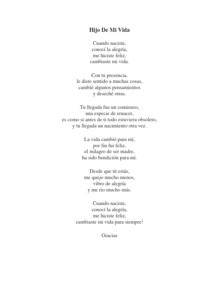 Cuando te tuve en brazos por primera vez cuando también por primera vez me miraste con tus lindos ojitos y me sonreíste Cada año y cada vez que has ido soplando las velitas del pastel. En la foto estamos mi hija y yo compartiendo nuestra primer mirada segundos después de su nacimientoEsto ha sido una pequeña dedicación para ella. Cuanto vi en tus ojos la mirada de tu madre dulce amanecer. 19-feb-2021 - Explora el tablero de Adriana Molina Poemas para un hijo en Pinterest. Teens Kids Website. Creo que fue ayer el primer día hijo de mi sangre y de mi amor. 20-oct-2019 - Explora el tablero de Judith Caro poema para mis hijos en Pinterest. 33054 likes 160 talking about this. El Hombre de la Rosa sabianya.